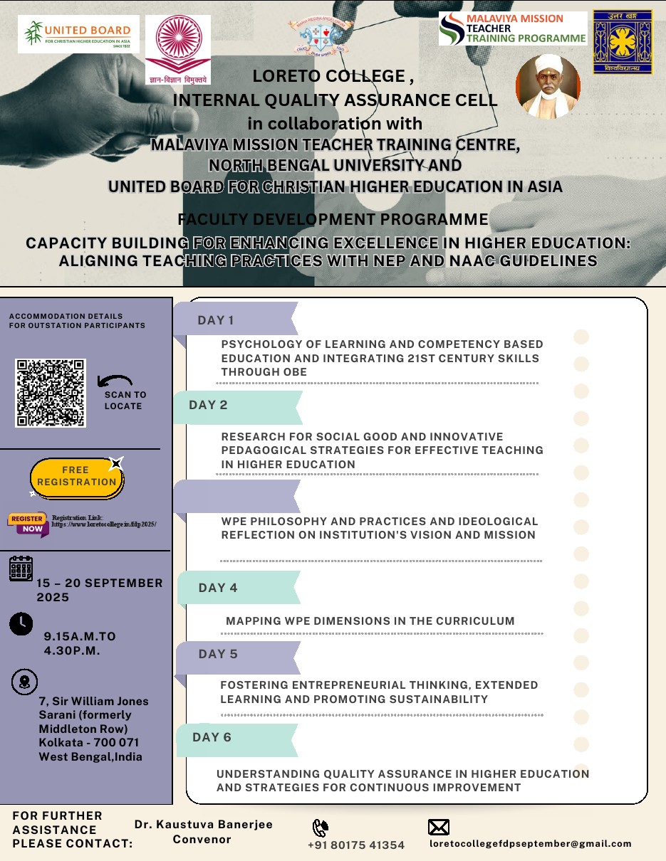 Loreto College, Kolkata, was established in 1912 by the Religious of the Institute of the Blessed Virgin Mary (I.B.V.M.). The order was founded by MARY WARD (1585-1645), a dynamic English Catholic lady, in an age when Catholics were persecuted in England. Europe was torn by religious dissension and women’s rights were generally ignored. A determined visionary, she managed, with the help of some devoted companions, to set up schools for young women.